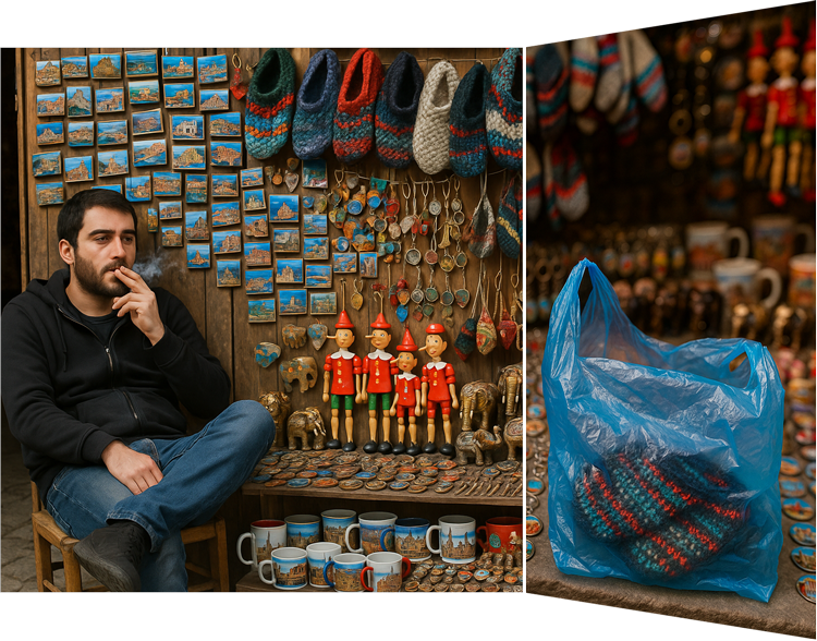 On street stalls, even genuine handmade crafts lose their meaning — fading among factory-made souvenirs brought from all over the world.
